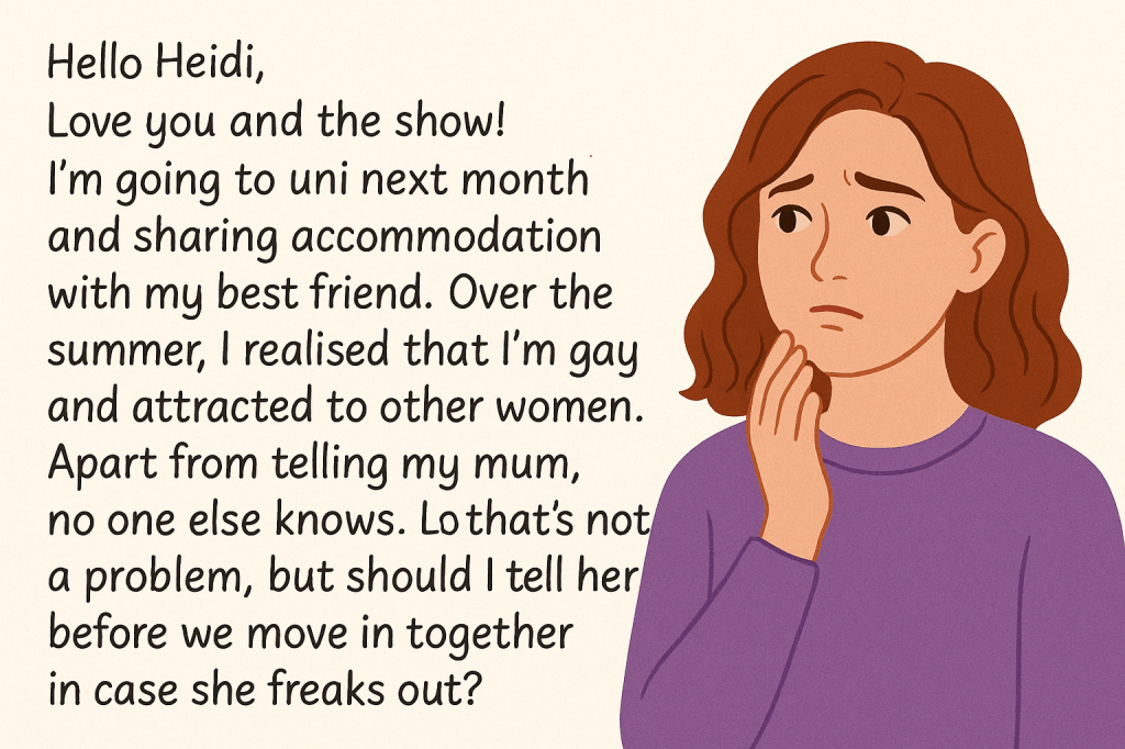Love you and the show! I’m going to uni next month and sharing accommodation with my best friend. Over the summer, I realised that I’m gay and attracted to other women. Apart from telling my mum, no one else knows. I don’t fancy my best friend, so that’s not a problem, but should I tell her before we move in together in case she freaks out?