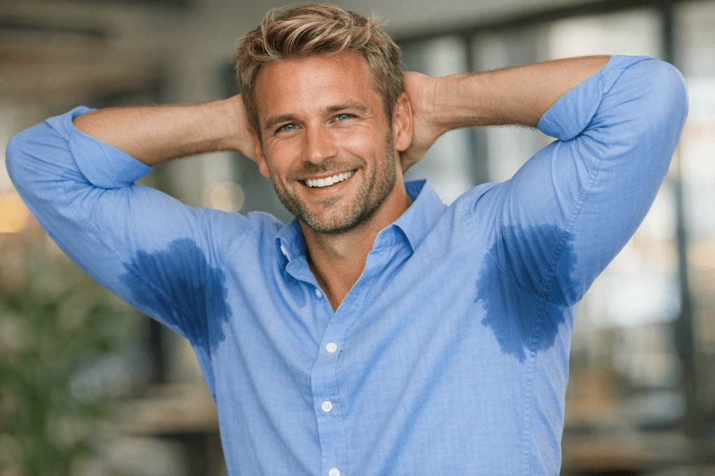 This is incredibly common, particularly with men. The most effective solution is underarm Botox, which temporarily blocks the nerves that trigger sweating. Results can last up to six months and it’s a real confidence booster. Alongside that, wear breathable fabrics, use a clinical-strength antiperspirant at night, and try to avoid caffeine before stressful events. But for a long-term fix, Botox is the gold standard.