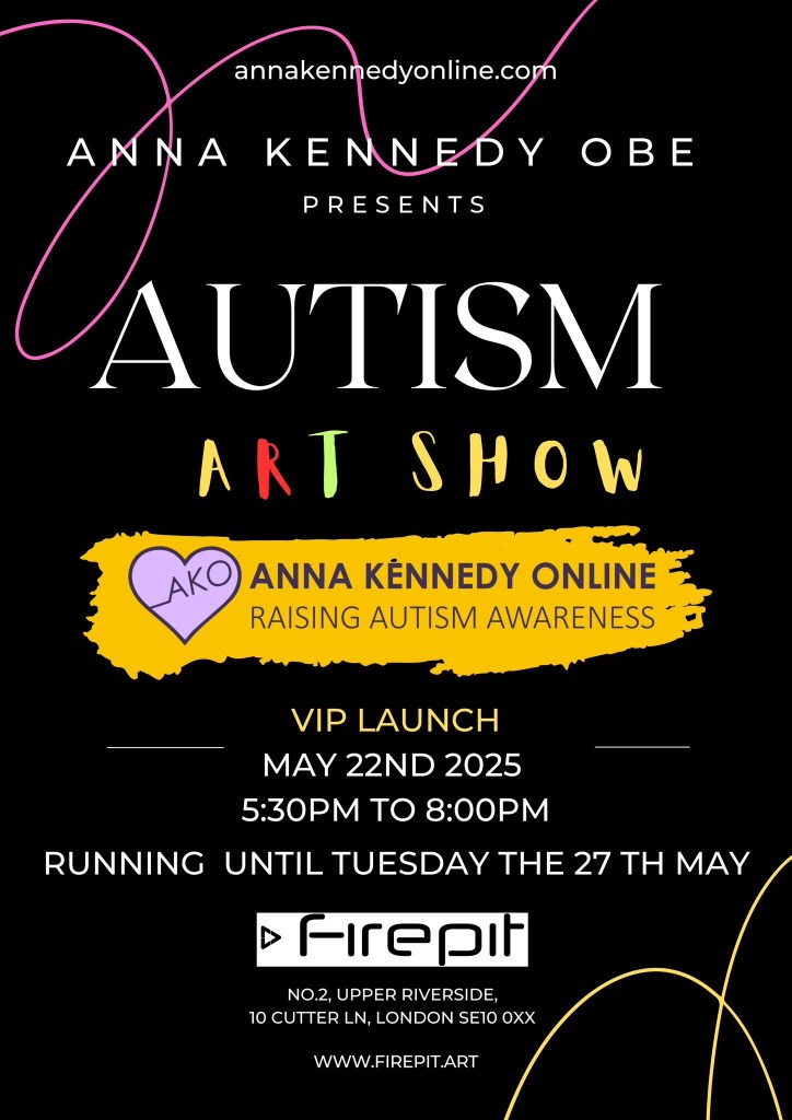 Anna Kennedy Online, in collaboration with the Firepit Art Gallery , is proud to present the first-ever “Autism & Art Show. “This exciting event showcases incredible artwork from autistic artists and their allies, with all profits supporting the charity Anna Kennedy Online. Art is more than just a passion—it serves as a therapeutic outlet, offering solace and joy to many individuals on the autism spectrum. With great enthusiasm, Anna Kennedy OBE, charity patron Steven Smith, and Firepit Art Gallery founder Markus Jake invite you to celebrate and support these talented artists. Ar) Event Location: Firepit Art Gallery CIC Firepit Gallery No.2, Upper Riverside, 10 Cutter Ln, Ground Floor Unit, Greenwich Peninsula London SE10 0XX Learn More & Support the Charity